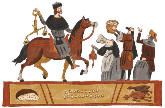 – «Джон Литтль держит одну виргату земли от Рамзейского монастыря. Он платит за это в три срока. И ещё на подмогу шерифу – четыре с половиной пенни; при объезде шерифа – два пенни сельдяных денег. И ещё вилланскую подать, плату за выпас свиней, сбор на починку мостов, погайдовый сбор, меркет, гериет и герзум. На Рождество – один хлеб и трёх кур в виде рождественского подарка; на пасху – двадцать яиц; за право собирать валежник – двух кур…»