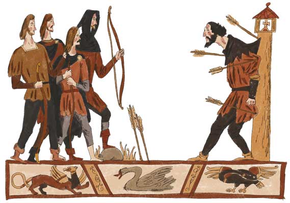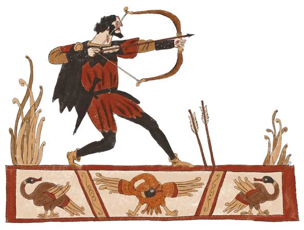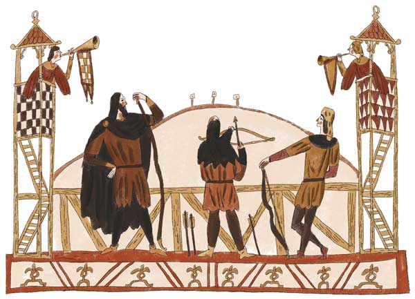 Наконец приготовления были окончены. Солнце грело лучникам спины и ярко освещало мишень. Прозвенела первая тетива, и стрела вонзилась в третий, самый широкий круг. Вихрастый мальчуган, не в силах пробиться сквозь тесную цепь толпы, просунул голову между ногами одного из зрителей.
