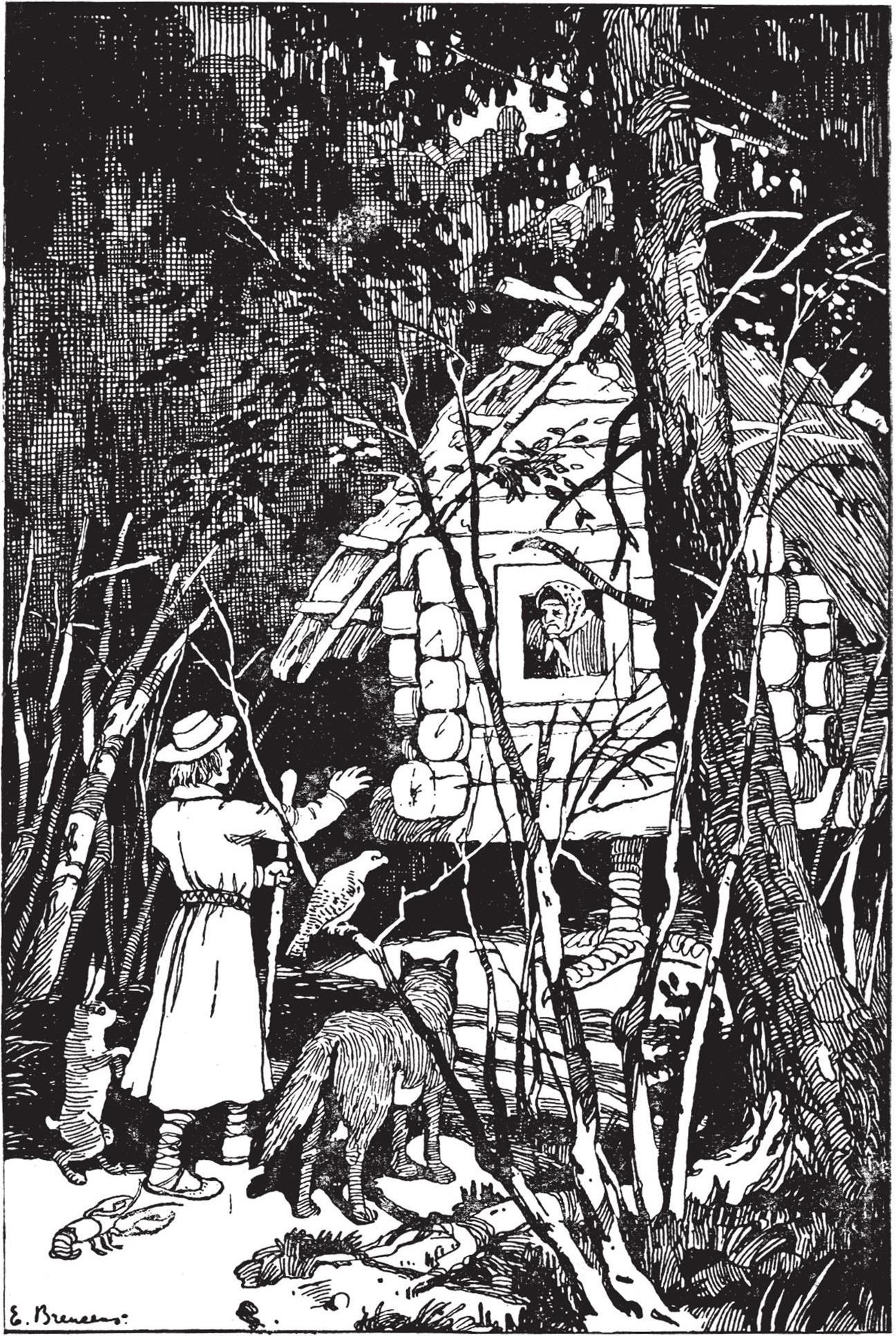 Labi. Puisītis-brālītis, zaķītis-lempītis, vilciņš-jērzaglītis, lapsenes-dūcējas, dunduri-sūcēji, vanadziņš-līknadzītis, vēzītis-krabiķis nu gāja taisni mežā iekšā. Otrajā dienā tie atron tādu māju dziļā mežā, kas uz vistas kājas griežas. To redzēdams, brālis sauc: “Istabiņa, istabiņa, apstājies, ceļavīri grib atdusēties!” Istabiņa tūlīt apstājās. Ceļa vīri nu saiet iekšā un atron tur vecu veceni. Vecene grib zināt, kur šie eimot, bet brālis saka: “Dod mums paēst, atvēli izdusēties, tad no rīta visu tev izteikšu!” Vecene tā ar mieru. No rīta brālis izstāsta vecenei galu no gala un lūdz, vai nevarot pateikt, kur viņa māsas atrodas.
