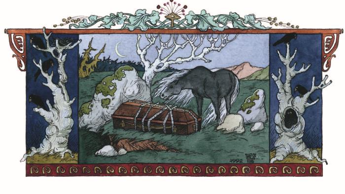 Опоясал тогда Илья меч-кладенец, привязал коня Святогорова ко гробу, положил перед гробом три земных поклона глубоких, смахнул слезу горючую и поехал на святую Русь, к князю киевскому, Владимиру Красному Солнышку.