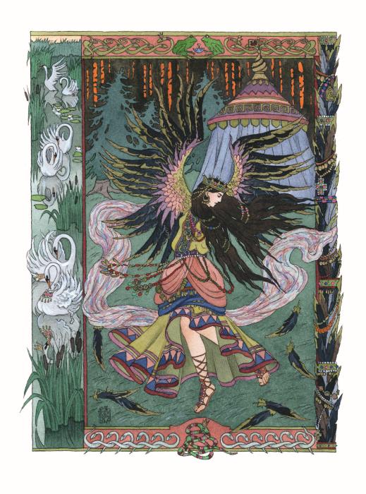 Вскочил Михайло Поток на ноги, вышел из шатра – не видит девицы, одни лебеди да гуси по заводям плавают. Присмотрел он лебёдку золотое перо – голова у лебёдки унизана нитями золотыми, перевита каменьями самоцветными, скатным жемчугом.