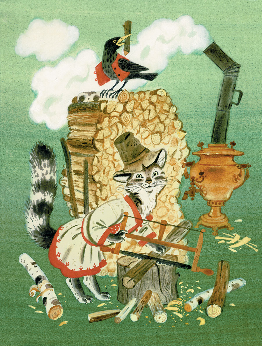 И пошли кот да дрозд далеко в лес дрова рубить. А лиса тут как тут – села под окошечко и поёт: