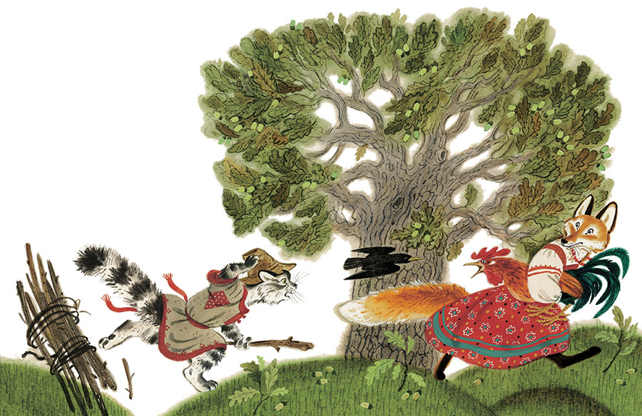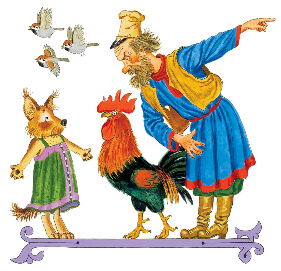 Несёт меня лисаЗа тёмные леса,За быстрые реки,За высокие горы…Кот и дрозд, спасите меня!..Кот и дрозд услыхали, бросились в погоню и отняли у лисы петушка.