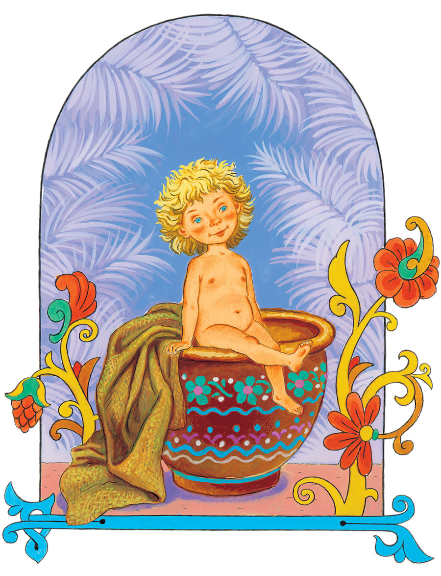 Однако старик принёс комочек снегу в избу, положил в горшочек, накрыл ветошкой и поставил на окошко. Взошло солнышко, пригрело горшочек, и снег стал таять. Вот и слышат старики – пищит что-то в горшочке под ветошкой; они к окну – глядь, а в горшочке лежит девочка, беленькая, как снежок, и кругленькая, как комок, и говорит им: