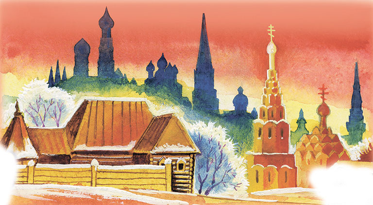 Подлетела к царскому крыльцу золочёная карета о шести белых лошадях, и выходит оттуда Василиса Премудрая: на лазоревом платье – частые звёзды, на голове – месяц ясный, такая красавица – ни вздумать, ни взгадать, только в сказке сказать. Берёт она Ивана-царевича за руку и ведёт за столы дубовые, за скатерти браные.