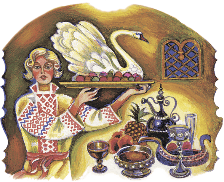 Царь с сыновьями, с невестками, с гостями сели за столы дубовые, за скатерти браные – пировать.