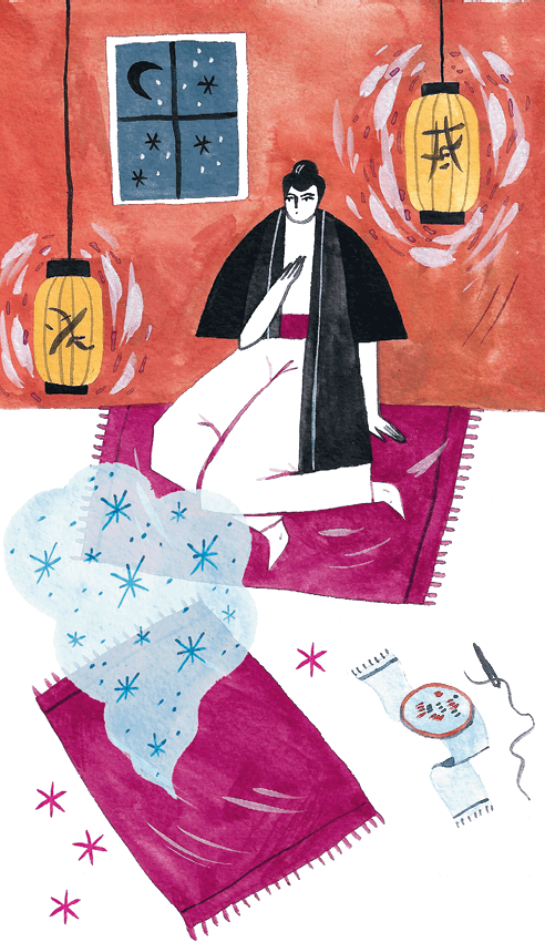Однажды вечером, уложив детей спать, Юки зажгла бумажный фонарик, села возле Минокичи и принялась шить.