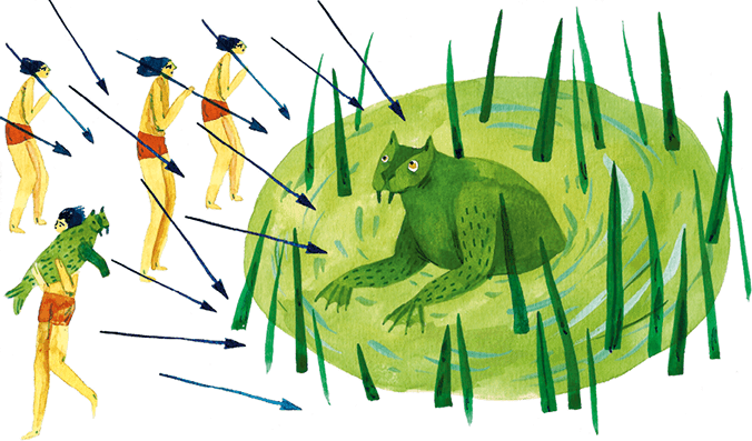 Только они так подумали, как взволновалась вода в озере и поднялась из подводного своего логова мать буньипа. Гневом полыхали её жёлтые глаза, каплями стекала вода с клыков. Страшно заревела мать буньипа, призывая детёныша, и молодые охотники задрожали от страха.