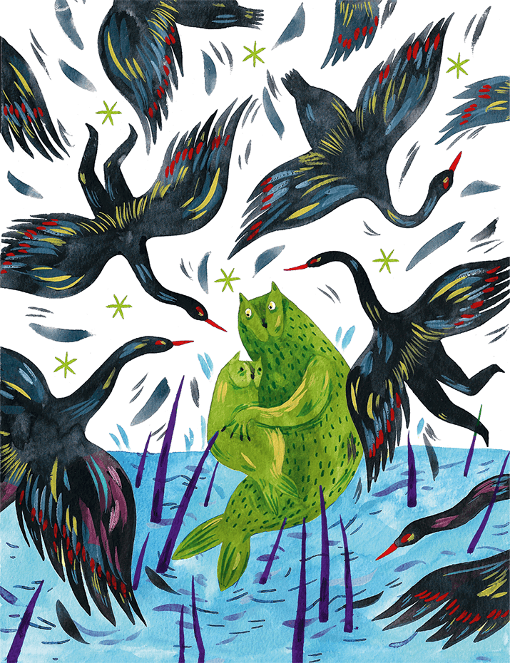 Обернулся молодой охотник, чтобы схватить жену свою за руку, как волосы на голове его стали дыбом – вместо жены перед ним застыла чёрная-пречёрная птица с длинной шеей и огненно-красным клювом. В тот же миг вместо рук у юноши выросли крылья, на ногах – перепонки и когти, и он тоже оборотился в птицу. Все люди вокруг тоже превратились в птиц, и заскользила по водной глади стая чёрных лебедей.