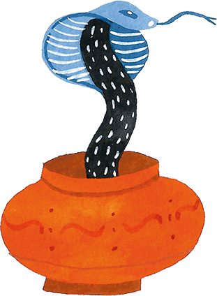Взяла медный кувшин, накрыла его тряпицей, чтоб не попала грязь, и спустилась к реке. Жарко палило солнце, и старушка решила искупаться в прохладной воде. Искупавшись, сняла она тряпицу с кувшина, чтобы наполнить его, а на дне кольцами свернулась ядовитая змея и сверкает своей чешуёй.