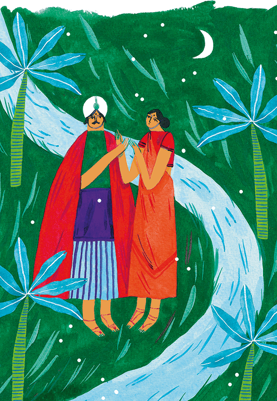 На следующий день принцесса убрала дом цветами и стала поджидать своего мужа. Королева змей сдержала слово, и чары развеялись. Вышел принц из реки в человечьем обличье и кинулся в объятия своей жены.