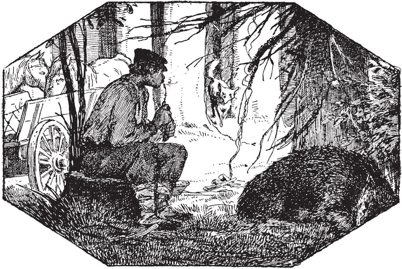 Vīrs lāci nosita un, kopā ar lapsu medu izēdis un cāļus un vistu apēdis, brauca uz mājām.