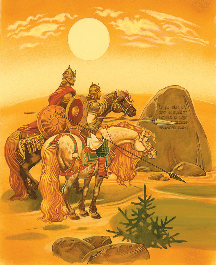 Вот едут верные друзья плечо в плечо, стремя в стремя, по сторонам поглядывают. Никого в степи не видно – ни богатыря, с кем бы силой помериться, ни зверя, чтоб поохотиться. Раскинулась под солнцем русская степь без конца, без края, и шороха в ней не слыхать, в небе птицы не видать. Вдруг видит Алёша – лежит на кургане камень, а на камне что-то написано. Говорит Алёша Екиму Ивановичу: