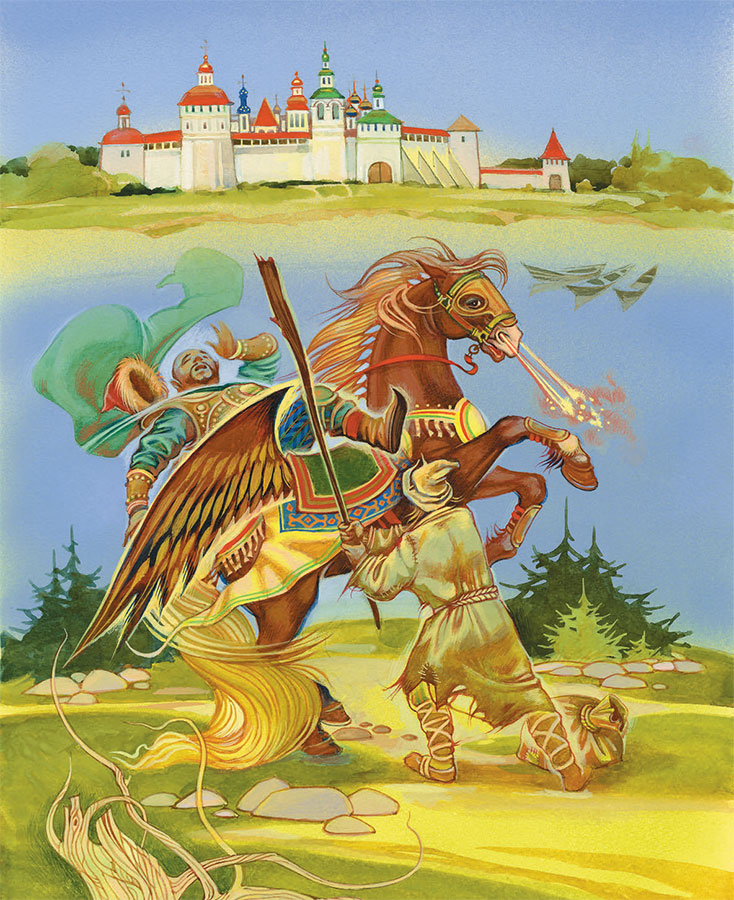 – Служи мне верно, богатырский конь. Не оставь меня ни мёртвым, ни раненым серым волкам на растерзание, чёрным воронам на расклевание, врагам на поругание! Где б мы ни были, домой привези!