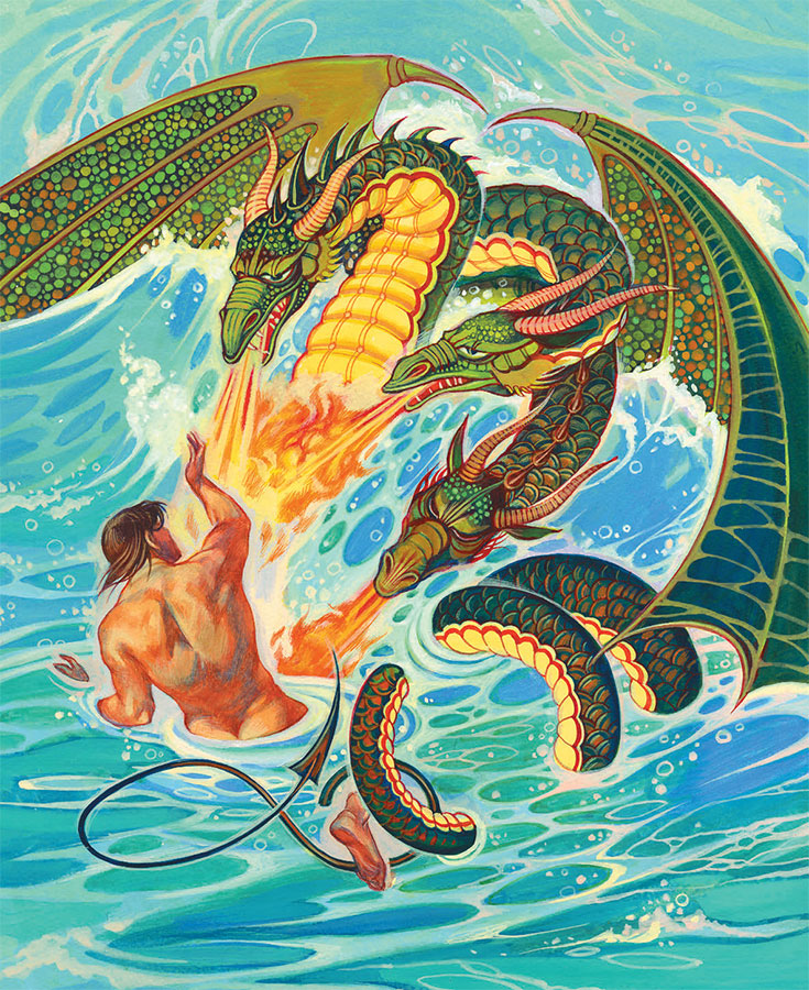 Поднял голову Добрыня и видит, что летит к нему Змей Горыныч, страшный змей о трёх головах, о семи когтях, из ноздрей пламя пышет, из ушей дым валит, медные когти на лапах блестят.
