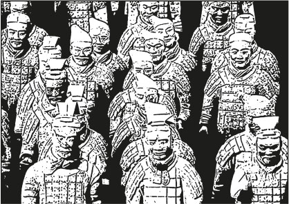 – Эй, я цзян, этого тоже к ним, – приказал бу цзян подбежавшему к нему младшему командиру, обращаясь к нему по чину. Тот быстро склонил перед ним голову и, отступив на шаг, махнув рукой, подозвал воина. Быстро подбежавший к ним воин, выставив перед собой мао, бамбуковое копье, слегка ткнул его железным наконечником путника в спину, кивком головы направляя его в сторону остановившейся колонны. Путник послушно побрел к людям и уже вскоре двигался вместе с ними, заняв место в последнем ряду. У всех ведомых людей на головах были синие повязки, что выказывало в них невольников.