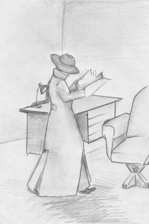 В небольшой комнатке без окон почти не было мебели. В углу стояло огромное кожаное кресло, чуть поодаль – старый, обшарпанный письменный стол. Возле единственной двери монументально высился старинный дубовый шкаф. Свет от настольной лампы падал только на поверхность стола, остальная часть комнаты скрывалась в полумраке. Стены комнаты окрашены тусклой серой краской, никаких украшений, картин или ковров. В одну из стен вбито несколько гвоздей, по всей видимости, у прежних хозяев этой комнаты на них висели две или три картины. Сейчас гвозди использовались в качестве вешалки, на них висел длинный, такой же серый, как и стены, плащ и большая широкополая шляпа.