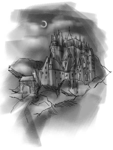 Зыбкий жёлтый месяц озарял ночь, поднимая на свой рог белую звезду. А в мрачном замке на холме фонарь то вспыхивал, то мерк, то загорался, то затухал, подобно тому, как костлявый Герцог крадучись появлялся то в одной комнате, то в другой, прихлопывая по пути летучих мышей и пауков, давя крыс.