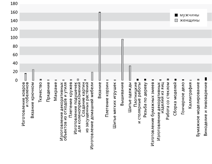 Диаграмма 2 демонстрирует распределение разных видов ремесленных хобби между мужчинами и женщинами. Гендерное распределение очевидно: женщины чаще работают с текстилем, мужчины – с деревом. Как следует из диаграммы, женщины в принципе занимаются ремеслом чаще, чем мужчины; это подтверждает точку зрения сторонников феминизма, согласно которой производство вещей в домашних условиях считается женским уделом[95]. По данным MO, более половины опрошенных женщин (160 из 260 респонденток) регулярно вяжут. Практически все вязальщицы утверждали, что вяжут параллельно с какой-либо другой деятельностью – например, когда смотрят телевизор, слушают музыку или радио. Вот некоторые ответы респонденток: «Вяжу вечером, когда смотрю телевизор»[96]; «Вязание – одно из моих хобби, и я занимаюсь им во время просмотра [телепередач]»[97]; «Я иногда вяжу вечером, когда смотрю телевизор»[98]; «Иногда вечерами вяжу совсем мало, если телепрограмма интереснее; если попадается сложный узор, я делаю больше»[99].