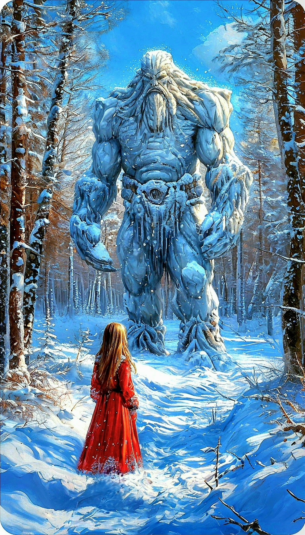 Спустя некоторое время девочка заметила: Духи зимнего леса куда-то исчезли, а из огромного сугроба вырос белый и мохнатый Великан.