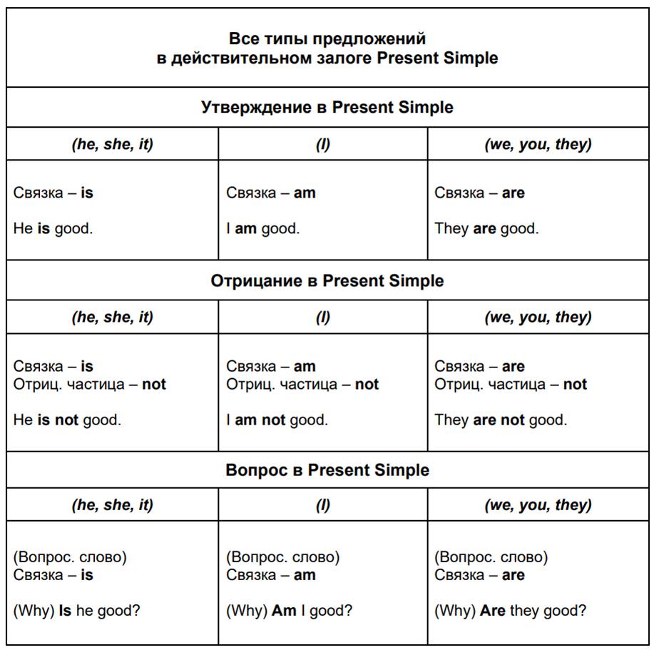 Чтобы эффективно использовать Present Simple, вам необходимо овладеть как структурой безглагольных, так и глагольных предложений. В последних может быть два залога – действительный и страдательный.