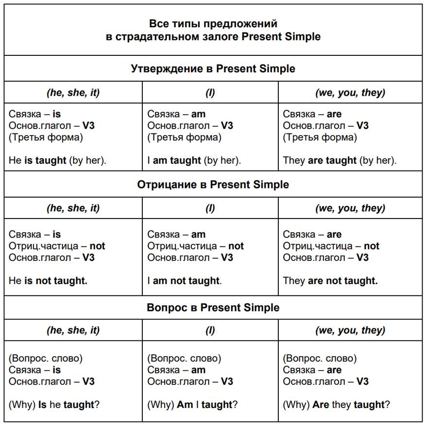 Перед тем как приступить к изучению правил построения всех типов предложений страдательного залога в Present Simple, ознакомьтесь со следующими понятиями: