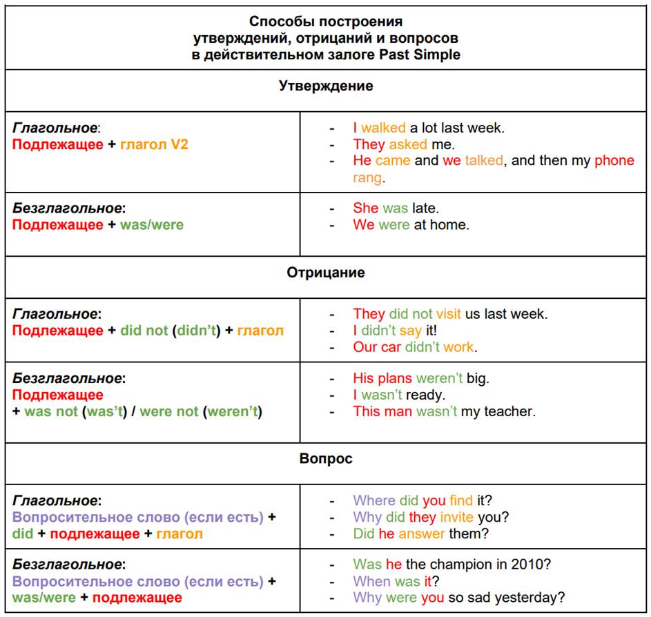 Эта таблица поможет вам понять, как строятся утвердительные, отрицательные и вопросительные предложения действительного залога в Past Simple.