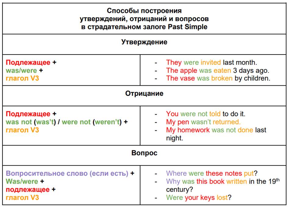 Past Simple Passive – это прошедшее время, страдательный залог. Past Simple вы можете использовать, когда хотите рассказать о чём-то, что было в прошлом. Passive voice (страдательный залог) фокусируется на самом действии, совершаемом кем-то.