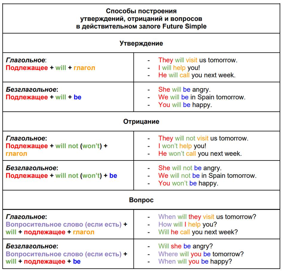 С помощью этой таблицы вы сможете понять, как строятся утвердительные, отрицательные и вопросительные предложения действительного залога во Future Simple.