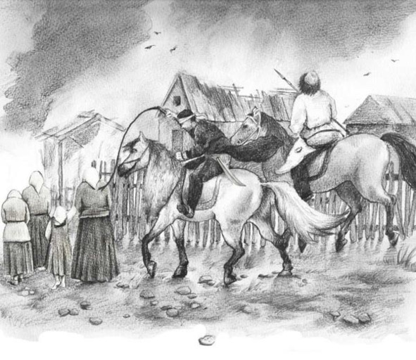 Загорелись поля пшеницы, задымили стога сена. Побежали с полей славянские женщины и дети, забрызганные собственной кровью. Их нагоняли на лошадях, кололи пиками. Озверевшие всадники поддевали детей, поднимая на пиках вверх. Хватали женщин и девочек, насиловали и если не убивали, то уводили с собой в плен. Насиловали даже старух! Забирали всё, что только можно увезти, угоняли скот, а оставшееся добро сжигали!