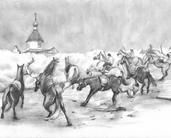 Каждый раз, когда конные варвары с пиками и саблями приближались к кругу из телег и брёвен, как лошади искусных наездников резко вскакивали на дыбы! Их словно обдавало пышущим жаром небесного огня!