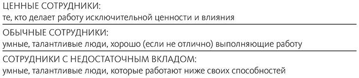 В этой главе я поделюсь идеями, возникшими у меня в ходе нашего исследования ценных сотрудников, и познакомлю вас с практиками и установками, благодаря которым их деятельность выделяет их на фоне других хорошо работающих сотрудников. Но сначала следует дать некоторые определения. Мы с коллегами рассматривали следующие категории персонала.