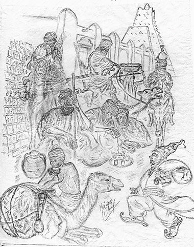 Обладая крайне любопытным и вороватым нравом и, вдобавок хорошей зрительной памятью художника, он без особого труда усвоил нехитрую геометрию улиц и площадей Тимбукту. Обзаведясь полезными, по его мнению, знакомствами, в лице торговцев специями, разносчиков лепёшек, продавцов ювелирных украшений[15], (коими Аль-Мажнун, щедро одаривал миловидных женщин за, как он сам любил поговаривать, – «приятные часы общения»), он очень быстро вписался в среду горожан.