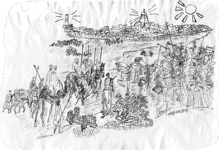 * * *Отделившись от городских ворот едва заметной дымкой и по мере приближения обретая различимые силуэты, к передовым отрядам халифа приближалась конная процессия воинов в богато украшенных золотом доспехах и остроконечных золотых шлемах. Её возглавляли знатные сановники и музыканты, а впереди ехал сам градоначальник Мусса-Ибн-Халид.