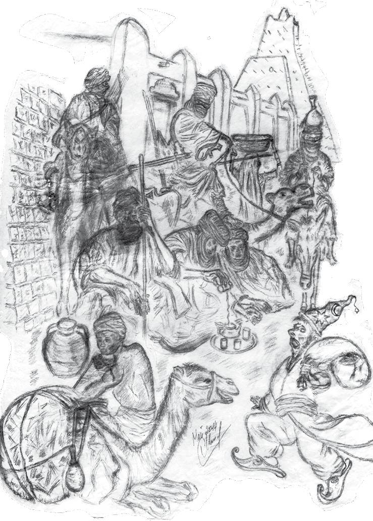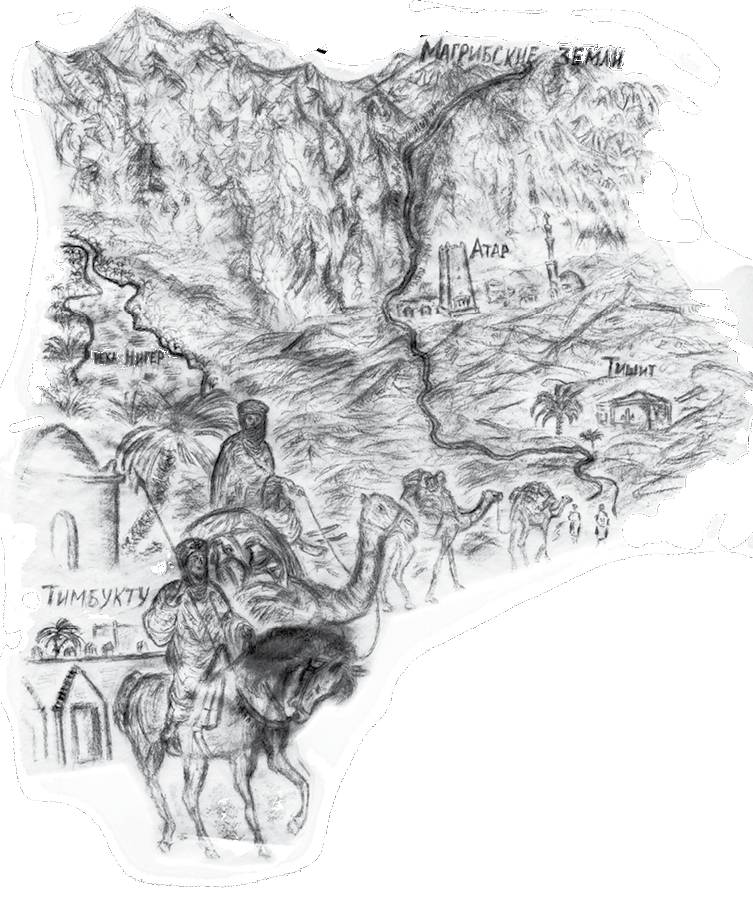 За годы работы в городе Мема, странствий с караванами торговцев и воинов, многочисленных водных путешествий по реке Нигер Аль-Мажнуну не раз приходилось останавливаться в Тимбукту. Обладая крайне любопытным и вороватым нравом и вдобавок хорошей зрительной памятью художника, он без особого труда усвоил нехитрую геометрию улиц и площадей Тимбукту. Обзаведясь полезными, по его мнению, знакомствами в лице торговцев специями, разносчиков лепёшек, продавцов ювелирных украшений[22] (коими Аль-Мажнун щедро одаривал миловидных женщин за, как он сам любил поговаривать, приятные часы общения), он очень быстро вписался в среду горожан.