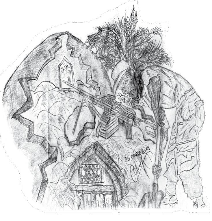 Пулемётчик Ибрагим-уалид-Мустафа готовит позицию для пулемёта в развалинах старой мечети, и натыкается на старинную дверь