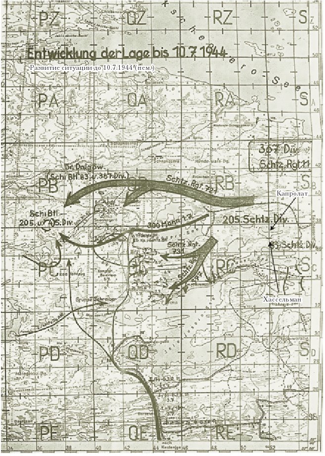 Постепенно немцы осознали всю силу и мощь первых русских атак и подтянули дополнительно крупные силы, чтобы не допустить окружения и не быть отрезанными от путей снабжения с запада. Эта операция показана на карте на предыдущей странице. До того как наступательная операция была остановлена, русским удалось обойти вокруг озера Капанец, и они начали угрожать разведывательному батальону и «высоте 200» с запада.