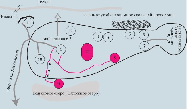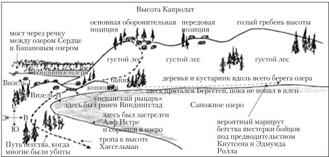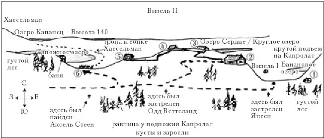 Рисунок позиции Визель II с бункерами и траншеями и заграждениями «испанский рыцарь». Виндингстад полагал, что около самой крутой горы была конюшня для мулов. Ее мы не нашли. На расстоянии около 25 м к юго-востоку от позиции Визель II были найдены останки Акселя Стеена (помечено крестом). Второй крест показывает примерно то место, где был расстрелян Одд Веттеланд. Третий крест показывает место, где, по словам Виндингстада, он нашел мертвого Янсена. На равнине около горы к северу от Визель II или ближе к Банановому озеру находилась бревенчатая конюшня для ослов и мулов, в которой держали скот между транспортировками. Постройка была с большими открытыми оконными проемами. По словам Виндингстада, несколько фронтовых бойцов закрепились в ней во время атаки русских, потом часть из них попала в плен, а часть бежала. Эта конюшня упоминается также как «обоз у Капролата». Возможно, здесь находился Кристиан Виллумсен до начала боев. Он был коноводом, но, по-видимому, заболел и был отправлен домой. Как рассказывал Сверре Хэскен, мулы свободно бродили вокруг в светлое время года. Хэскен базировался на Капролате, но во время битвы находился в отпуске.