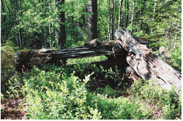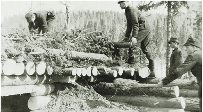 Строительство бункеров, как это делалось во многих местах в Карелии, – несколько рядов из срубленных бревен в лапу, покрытых сверху камнями и землей. Перекрытия обычно неплотные, и внутри бункера древесина хорошо сохраняется и не гниет (фото из журнала «Gebirgsjäger im Bild» (см.: Журнал «Горный егерь в фотографиях») амбразура