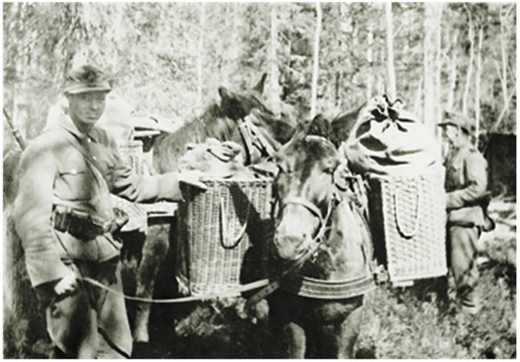 Снабжение высоты Капролат усложнялось в период после схода льда и снега. Когда груз невозможно было везти на санях и нартах, использовали мулов и иногда лошадей. На фотографии можно видеть двух мулов с поклажей. Имена солдат неизвестны (фото из архива Улы Сэли)
