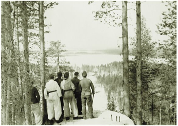 Шестеро бойцов на вершине высоты Капролат с видом на озеро Сердце (Круглое озеро) на западе. На расстоянии десятиминутной пробежки внизу располагалась позиция Визель I. Справа в снегу – три ручные гранаты (фото из архива Улы Сэли)