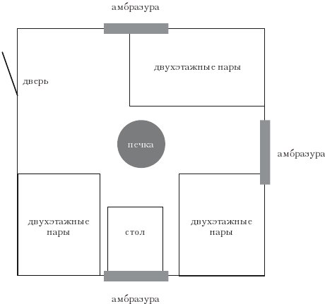 Рисунок показывает расположение внутри пулеметного бункера (ДЗОТа). Рисунок сделан согласно сведениям, полученным от Эгиля Ларсена, Алфа Борге, Лаурица Лофстада и Улы Сэли: «Там был стол, три двухэтажные кровати, печка Тодт, три амбразуры и одна дверь, один пулемет МГ 42 с боеприпасами и дрова, некоторые личные вещи»