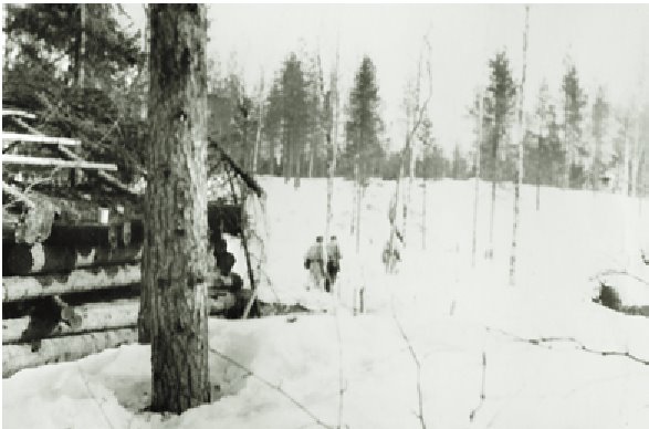 Двое солдат идут от основной оборонительной линии полосы к передовой позиции для смены караула. Слева виден один из пулеметных бункеров (ДЗОТов), срубленный из крупных бревен. Над перекрытием пристроена еще одна легкая скатная крыша из жердей, а на ней – ветви и кусты в качестве камуфляжа. Это, возможно, «бункер Стормуен» (фото из архива Улы Сэли)