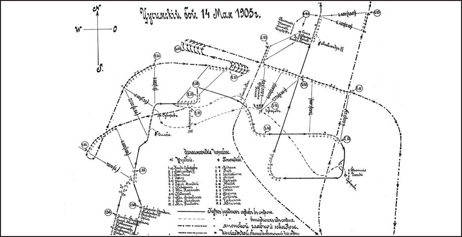 Цусимское сражение состояло из дневного боя 14 мая 1905 года, продолжалось около пяти часов (с 14 до 19 ч по местному времени), атак русских кораблей японскими миноносцами в ночь на 15 мая и боев отдельных кораблей днем 15 мая. Позднее в литературе появилось множество схем эволюций сражающихся флотов, мы же здесь дадим одну из первых, составленную для книги Худякова «Путь к Цусиме», выпущенной в 1909 году.