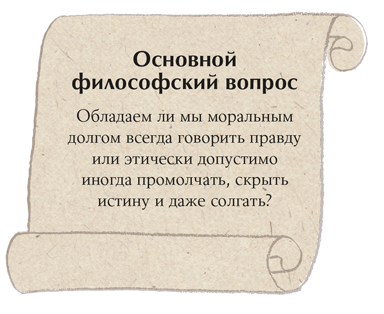 Скорее всего, вас, как и большинство людей, учили, что лгать нехорошо. Нужно всегда говорить правду. Звучит яснее ясного, не правда ли? Это учение известно в философии как деонтология: она утверждает, что есть абсолютные правила морали и мы обязаны им следовать. Нарушивший правила поступает аморально. Самым известным сторонником такого подхода к морали был Иммануил Кант (1724–1804). Он резюмировал эту идею в тезисе, который назвал категорическим императивом: действуй только в соответствии с таким принципом, который мог бы стать всеобщим законом. То есть если вы думаете, что какое-то действие аморально (солгать, например), то оно аморально всегда и для всех, без исключений.