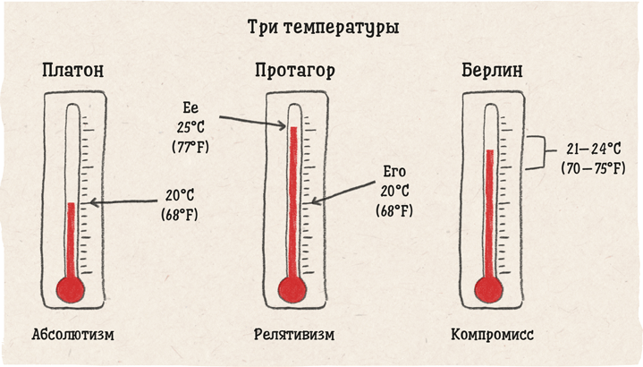 Итак, ваша позиция по вопросу термостата – абсолютистская: есть идеальная температура, и это не вопрос перспективы. Тогда правы либо вы, либо ваш партнер. Но позиция вашего партнера – релятивистская: некоторые более чувствительны к холоду, это не вопрос правоты и неправоты. Возможно, вы могли бы прийти к компромиссу в соответствии с аргументами Берлина. Хотя и могут быть небольшие различия во мнениях (несколько градусов, только и всего), все же возможен консенсус, какую температуру считать приемлемой или, по крайней мере, какой диапазон. Примите это.