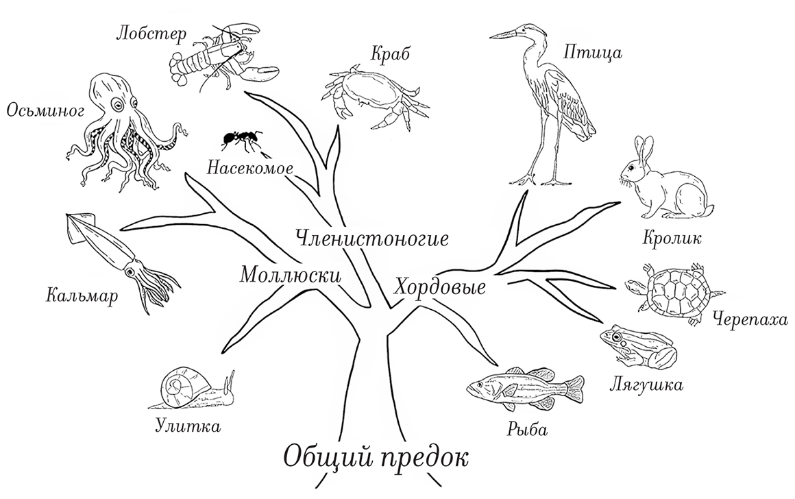 Дивергенция? Нет, конвергенция!Один из краеугольных камней теории Дарвина состоит в убеждении, что все виды живых существ произошли от единого предка. С течением времени эти виды все больше отдалялись от первоисточника под влиянием различных сил, связанных с окружающей средой и выживанием. Так родилось великое разнообразие, которое столь радостно наблюдать сегодня. Изображения эволюционного древа жизни, подобные тому, что приведено на рис. 2.1, показывают, каким образом различные широкие группы животных произошли от общего предка. Например, млекопитающие, рептилии, рыбы и птицы известны как хордовые и являются частью широкой группы животных, именуемой Chordata phylum. Таким образом, предполагается, что все млекопитающие (включая нас с вами), а также рептилии, рыбы и птицы произошли от общего, более примитивного вида. Хордовые, в свою очередь, равно как и другие группы животных, вроде артроподов (крабов, лобстеров, насекомых) и моллюсков (осьминогов, улиток, кальмаров), являются частью еще более крупного царства животных и, следовательно, имеют общего, еще более древнего и примитивного предка.