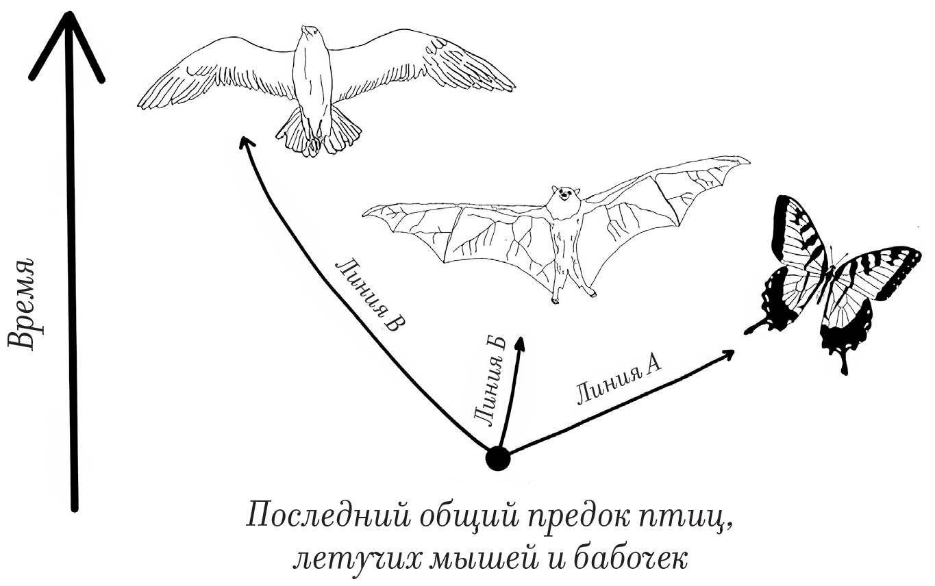 Рис. 2.2. Графическое представление конвергентной эволюции крыльев. Последний общий предок птиц, летучих мышей и бабочек не обладал крыльями и не умел летать. Крылья сформировались независимо друг от друга как минимум у трех видов (к ним по порядку ведут литеры А, Б и В)