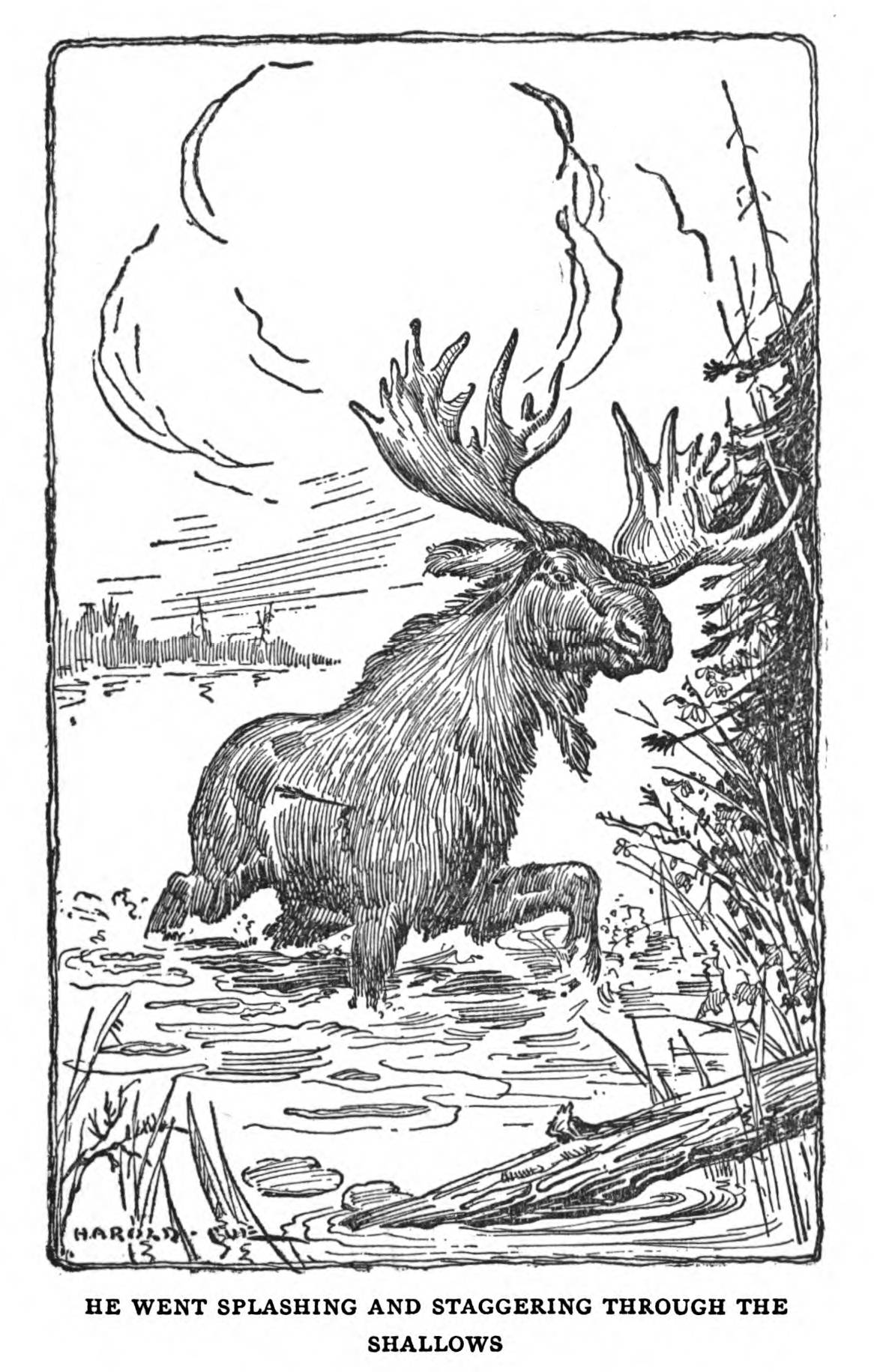 Когда мы доехали до большой тропы, идущей к водоему, то увидели, что медвежья семья прошла там; их следы спутать было нельзя. Мы пошли по следам, не наступая на них, и нашли место, где медведи свернули к болоту, как я и предполагал. Мы вернулись назад, прошли через кусты и лес к краю пруда и выглянули. Похоже, сами боги в тот день вели нас: прямо к нам по краю воды шел лось, иногда останавливаясь, чтобы бросить взгляд поверх зарослей красной ивы и обнюхать ветер, дующий из нижней части долины. Я прислонил ружьё к дереву и приготовил лук со стрелами. Он приближался, не ожидая никакое опасности, и, когда до него оставалось не более пятнадцати шагов, я выпустил стрелу, которая вонзилась в него прямо за плечом. Он зафыркал и развернулся, получил еще одну стрелу в другой бок, сделал несколько шагов по отмели и замертво упал на берег.