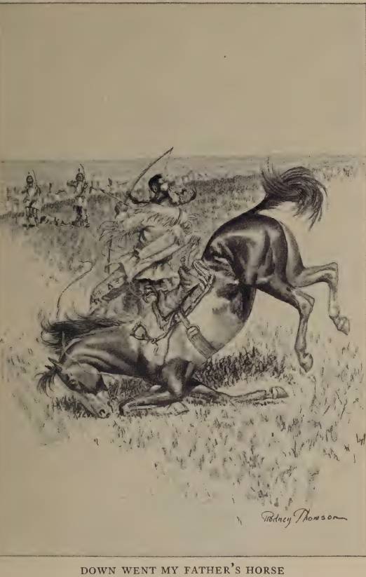 Теперь тропа снова спускалась на дно ущелья и расширялась, и нам снова нужно было подгонять лошадей, нахлестывая их и не давая разбегаться, и они с рыси перешли на галоп. Так двигаясь, мы потеряли из виду наших преследователей. Мы уже поднялись до уровня равнины и видели за стеной утесов ее склон, покрытый зеленой травой. Но тут на вершине последнего утеса справа внезапно появились три вражеских разведчика и, натянув луки, приготовились стрелять в нас, когда мы будем проезжать под ними. Они танцевали, пели и знаками призывали нас приблизиться к ним. Они были уверены в том, что с помощью отряда, который нас преследовал, они скоро получат наши скальпы, лошадей и всю их поклажу. Мы с мамой думали так же. Да, нам пришел конец. Тут отец вдруг указал направо и вверх, крикнул мне следовать за ним, а маме – следить за лошадьми и гнать их дальше по тропе. Я увидел, что там, куда указывал отец, в стене утесов был проход – очень узкий и очень крутой, но вполне проходимый. Я последовал туда за отцом, поднялся через него на равнину, и мы оказались рядом с тремя разведчиками, стоявшими на краю утеса. Лошадь моего отца была намного быстрее моей, он сильно ее подгонял и оставил меня далеко позади. Он выехал прямо к этой троице, которые поджидали его с луками наготове. Они выпустили в него стрелы, он тоже пустил в них стрелу. Средний из врагов упал, упала и лошадь моего отца, но сам он приземлился на ноги и почти сразу пустил стрелу прямо в грудь второго, а третий развернулся и побежал к разрыву среди утесов, через который мы пришли – без сомнения, намереваясь присоединиться к своему отряду, который поднимался по тропе. Отец выпустил в него несколько стрел, но не попал, а преследовать его он не мог, потому что повредил колено, когда прыгал с упавшей лошади.